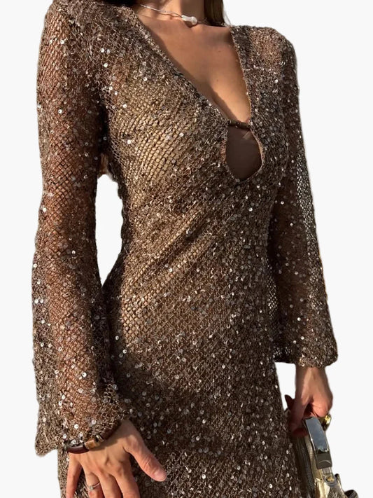 Damska cekinowa sukienka z głębokim dekoltem i elegancką sylwetką – idealna na uroczyste okazje