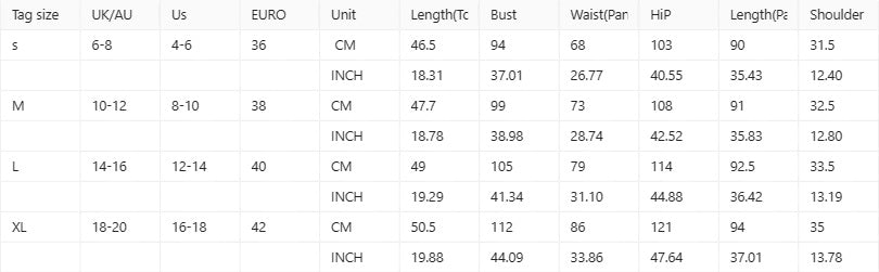 | Größe | UK/AU | US | EURO | Länge (CM) | Brust (CM) | Taille (CM) | Hüfte (CM) | Schulter (CM) |