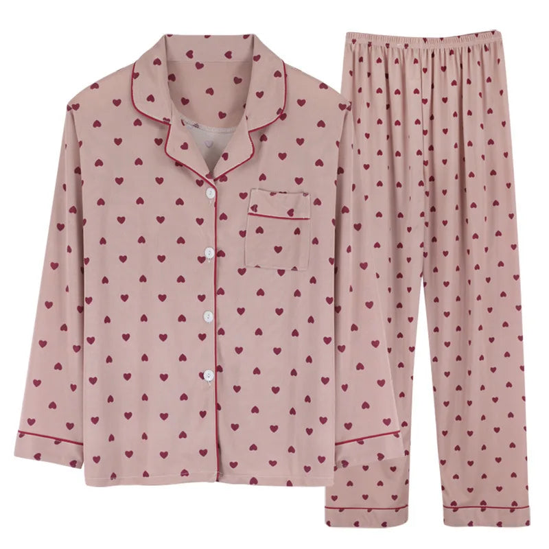Damen Schlafanzug mit Herzmuster – Langarm-Set mit Knopfleiste & Elastikhose