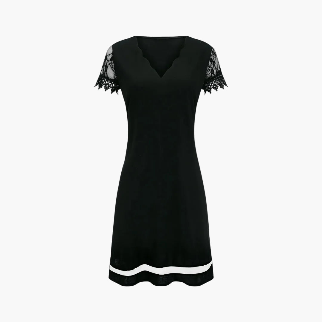 Denna svarta klänning med spetsärmar och vågig fåll förenar enkel elegans med modern charm. Den raffinerade, vågiga urringningen och de fina spets-cäppärmarna ger klänningen en särskilt feminin touch. Det lätta, behagligt fallande tyget ger en bekväm känsla och smiter mjukt åt figuren. En subtil, transparent fåll ger looken en antydan av finess – perfekt för festliga kvällar, fester eller speciella tillfällen. Kombinera klänningen med iögonfallande smycken och högklackat för en glamorös framtoning eller satsa på diskret chic med minimalistiska accessoarer.